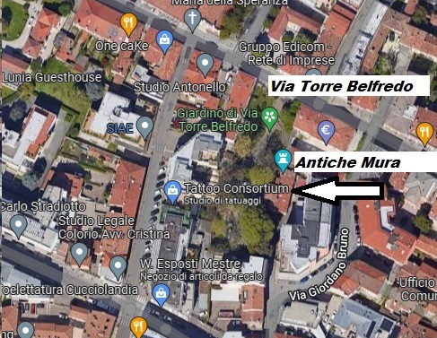 Le mura, o forse poche pietre, site all’interno del giardino della CaRiVe sono menzionate anche dal Fapanni nel libro Il 24° e le descrive lunghe circa 9 metri, alte 5 e larghe 2. Non è rimasto intatto neppure questo piccolo pezzo di muro in centro sito fra via San Rocco e Via Manin. Un muro che non dovrebbe essere stato molto lontano dalla Torre di Ca’ da Mosto.